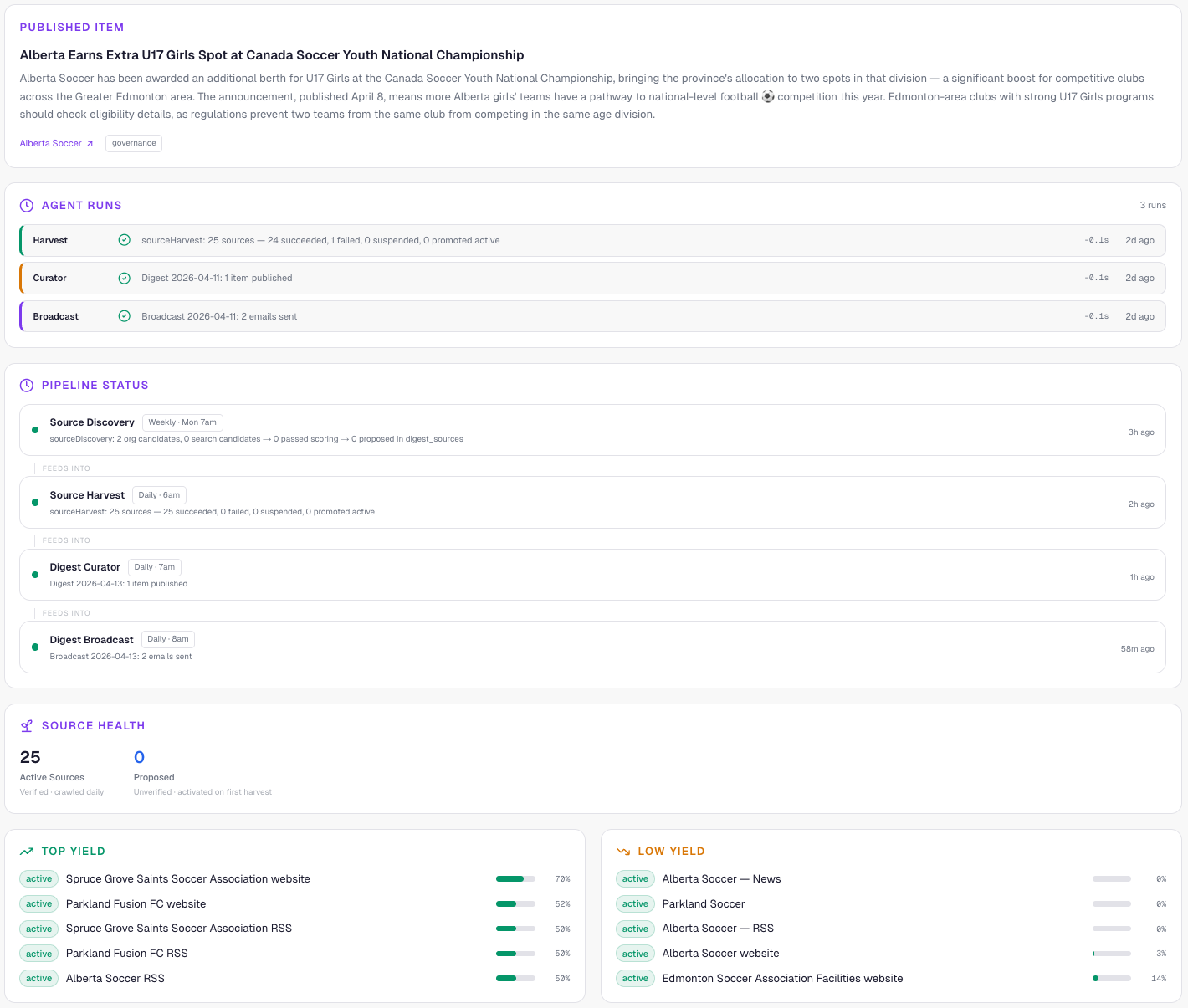 At 6am, the harvest agent wakes up and crawls every source I’ve pointed it at — local news sites, organization pages, RSS feeds. It pulls everything football-related into a staging table and tracks which sources keep delivering and which ones have gone dry.