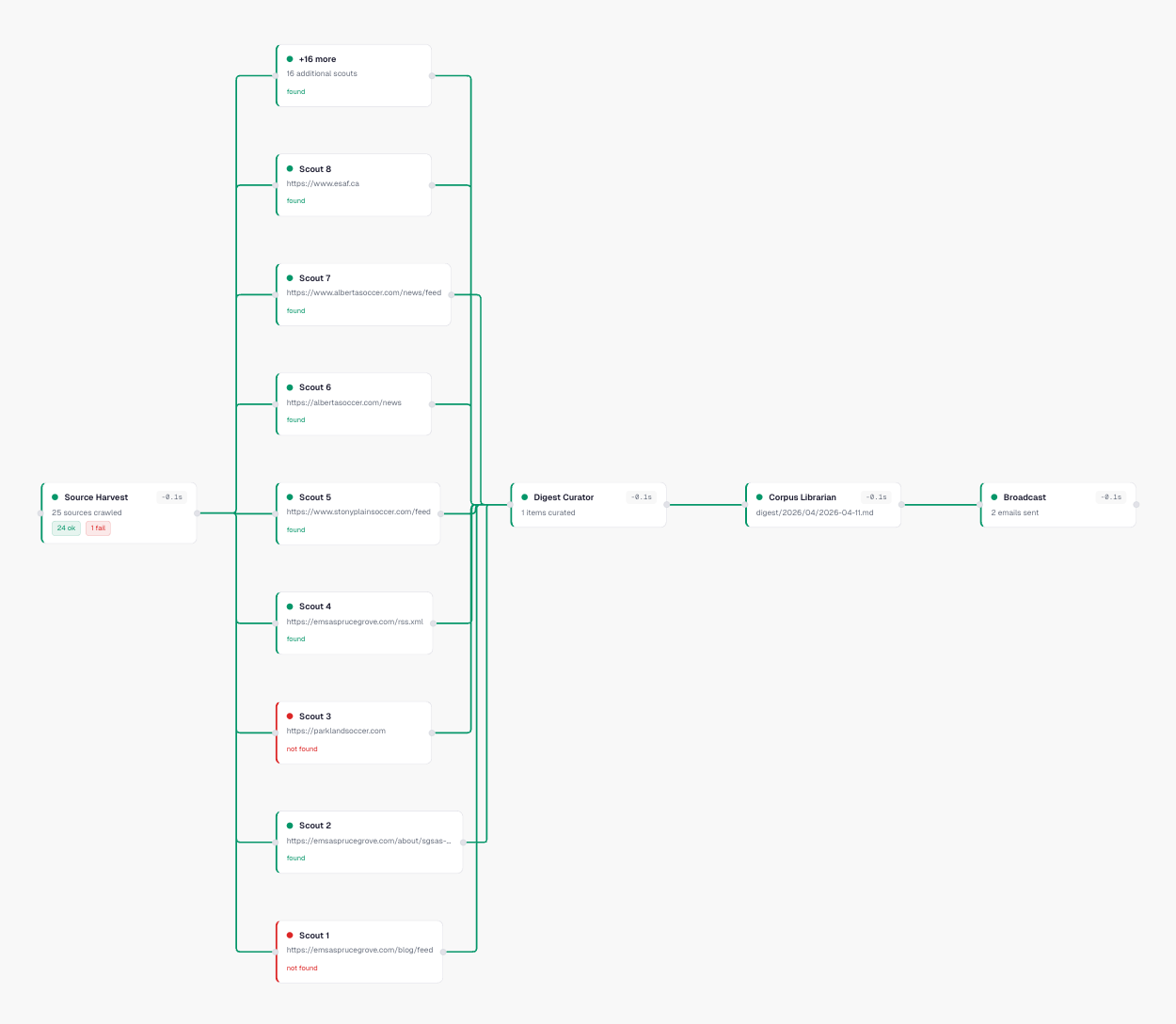 This is the call graph for a single morning's pipeline run. Source Harvest fans out into individual scout promises — one per source URL. Each scout shows whether it found new content or came back empty. Green means it delivered. Red means the source was down or had nothing new. The pipeline flows left to right: harvest → curator → corpus librarian → broadcast. Every node shows its duration.